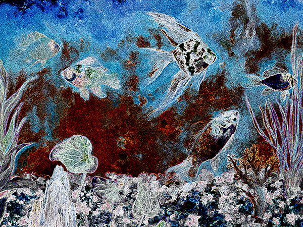 “Angelfish – EI” is an exquisite creation by artist Chau Ming Beck based on her original oil painting, Angelfish – OF, enhanced through computer processing. The artwork portrays an adorable school of tropical fish that has mistakenly ventured into the depths of the sea. Surrounded by darkness with no visible changes in their environment, they appear bewildered and helpless. Despite the simplicity of the solution, all they need to do is exert their efforts to ascend through the darkness, breaking through to rediscover the world that rightfully belongs to them.