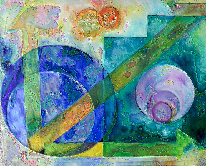 “Direction – EI” is an artwork created by the artist Chau Ming Beck, based on the original piece “Directions – OA.” This artwork essentially preserves the core of the original. The arrows symbolize time’s passage, while the circles and squares represent the concepts of cycles and space. The color palette remains true to the original with its shades of blue, green, yellow, and purple. However, in this artwork, there are some distinct irregular spots that signify the uncertainties in life. In this new creation, the artist introduces unique elements that blend in a distinctive way with the composition, conveying deeper meanings.