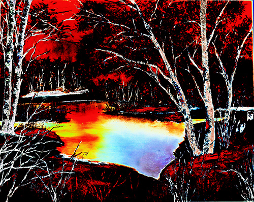 “In Blue and White – EF” is an artwork by the artist Chau Ming Beck, derived from her original creation “In Blue and White – OL,” which has been further enhanced. In this piece, we find ourselves in a night filled with enchantment. A blood moon hangs in the sky, casting a deep red halo, akin to countless bonfires ablaze in the darkness. The dense forest is enveloped in this mysterious crimson glow, with each leaf resembling a star ignited by magic, outlining a series of peculiar scenes. The small lake of the night shimmers under the enchanting blood moon, presenting a display of vivid colors.